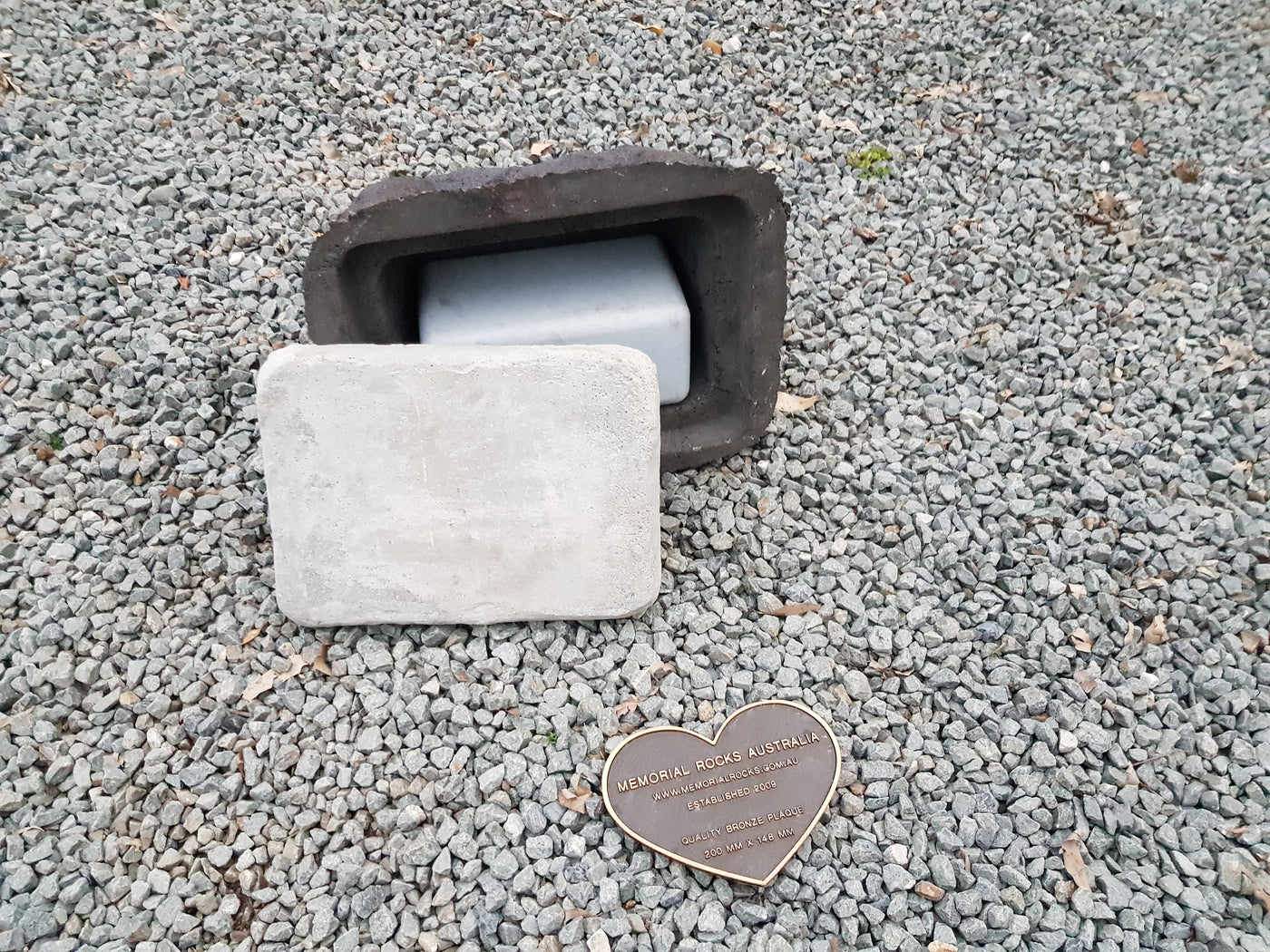 Proudly an original Australian product idea operating since 2009. Large Single Size Approx. 24 kg. Memorial Rock/Stone/Urn with a sealable internal cavity for the safe-keeping of a loved one's ashes. Holds one standard Australian sized ash container, plus memorabilia. Size Approx. 450mm x 390mm x 300mm (external). 270mm x 230mm x 170mm (interna...