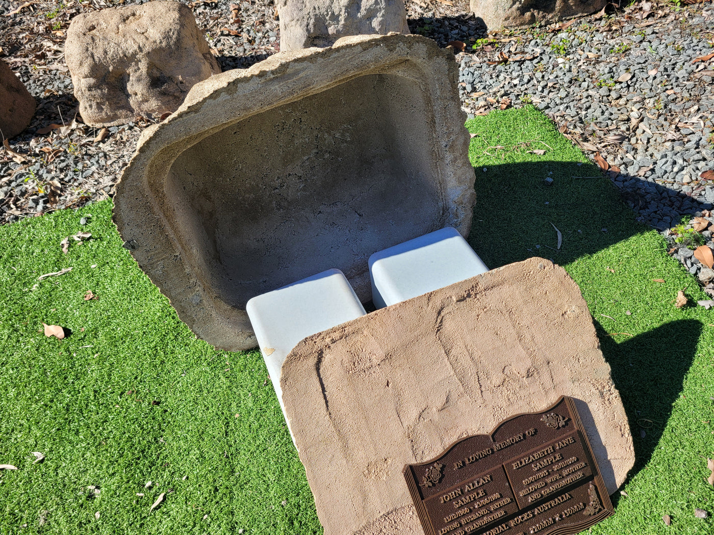 Proudly an original Australian product idea operating since 2009. Large Double Size Weight (approx. 24 kg) Memorial Rock/Stone/Urn with a sealable internal cavity for the safe-keeping of a loved one's ashes. Holds one or two standard Australian sized ash containers, plus memorabilia. Size Approx. 490mm x 410mm x 300mm (external). 320mm x 260mm ...