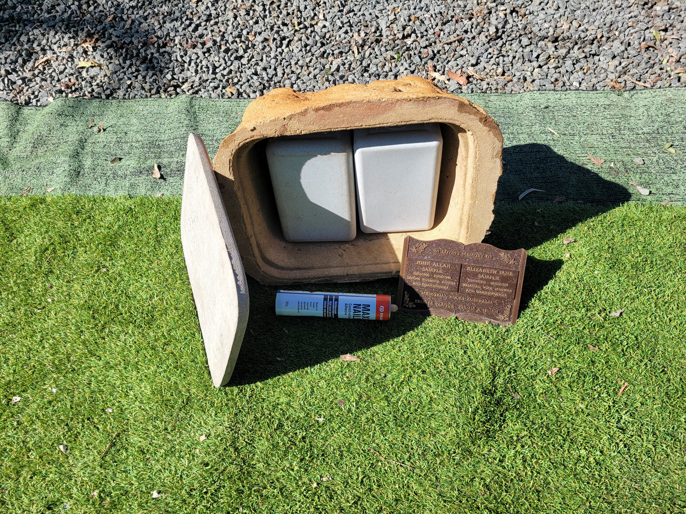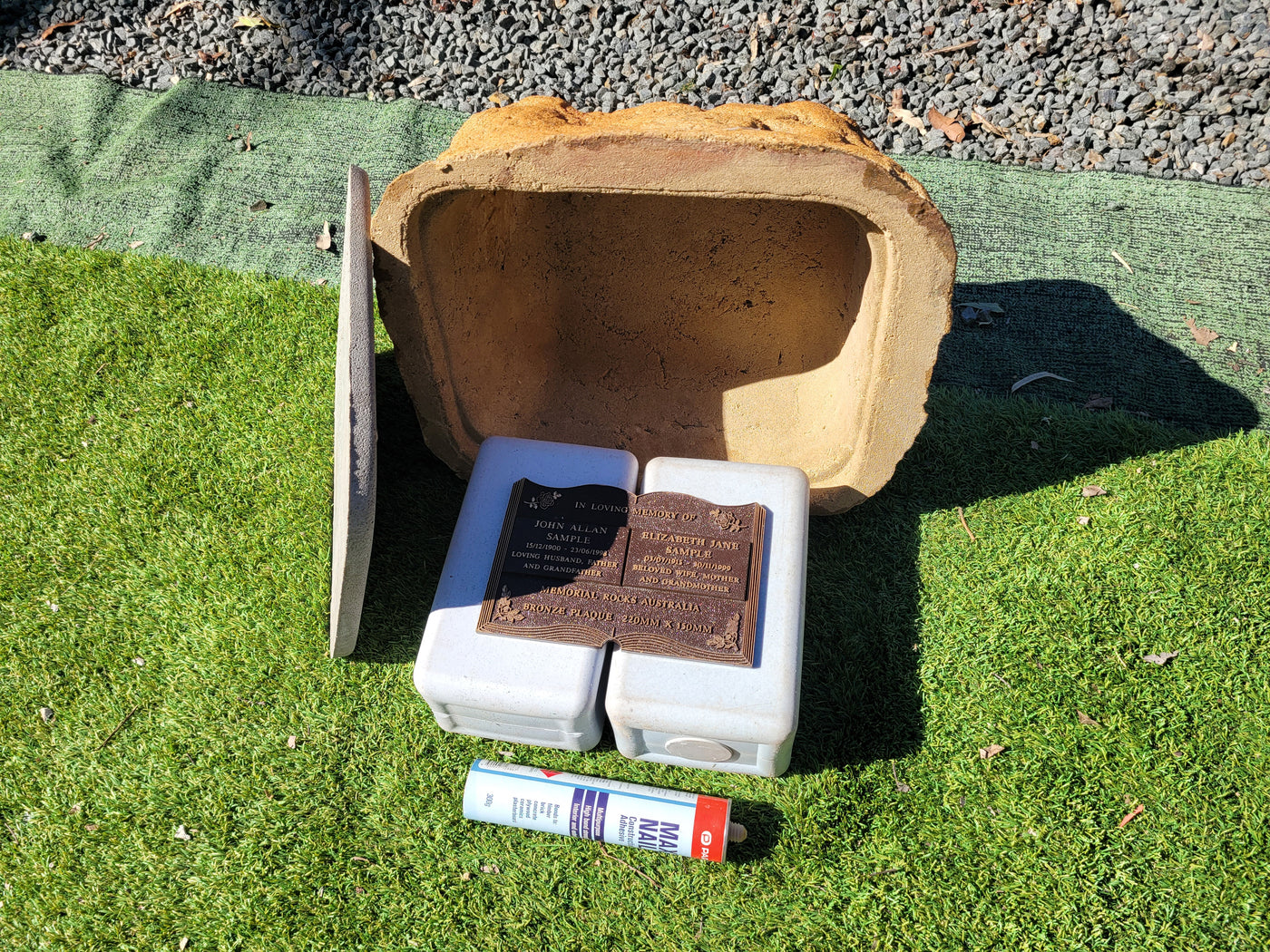 Proudly an original Australian product idea operating since 2009. Large Double Size Weight (approx. 24 kg) Memorial Rock/Stone/Urn with a sealable internal cavity for the safe-keeping of a loved one's ashes. Holds one or two standard Australian sized ash containers, plus memorabilia. Size Approx. 490mm x 410mm x 300mm (external). 320mm x 260mm ...
