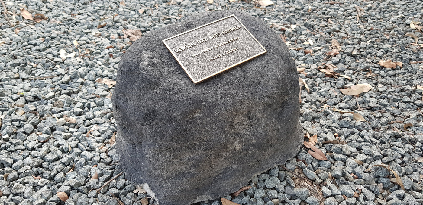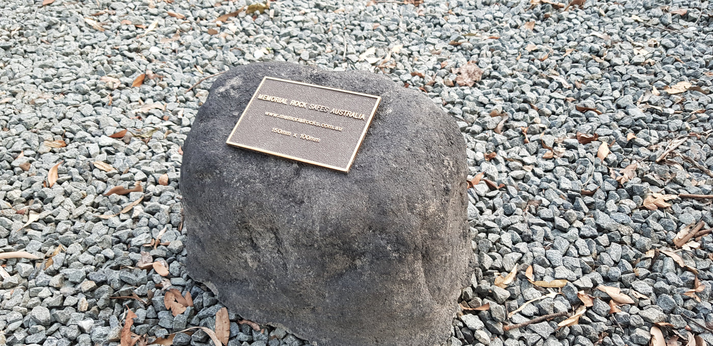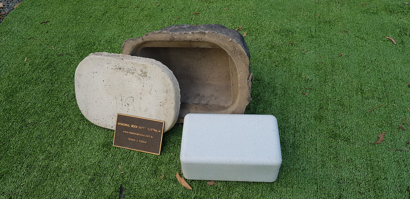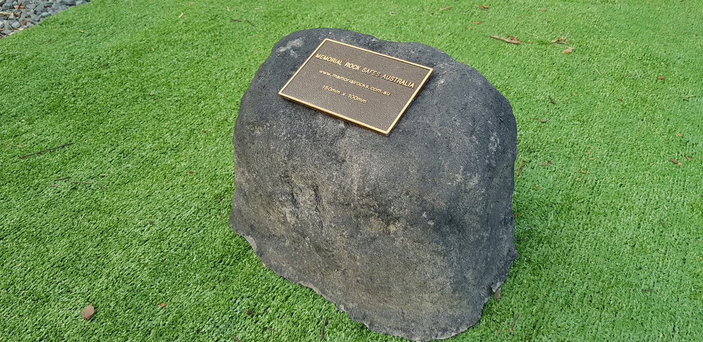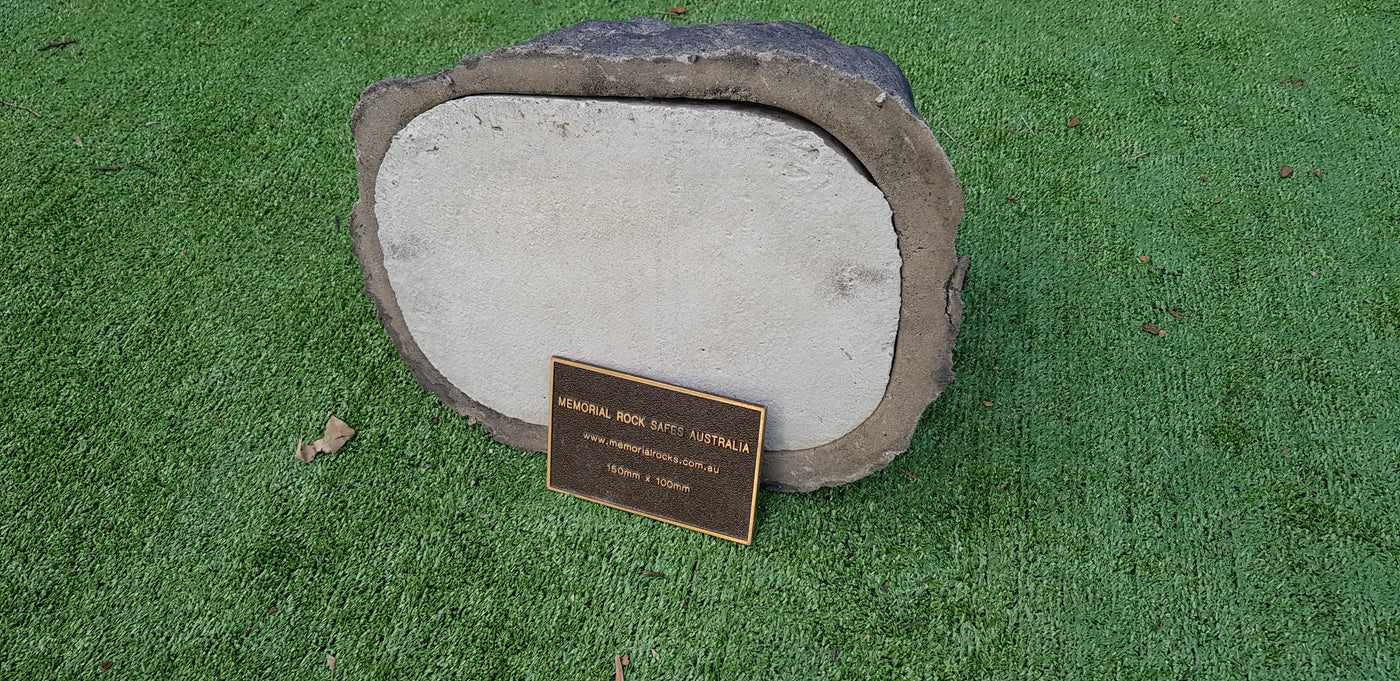 Memorial Rock Urns are a loving practical alternative for the safe keeping of a loved one's ashes. This Memorial rock has an incorporated flat space for up to a 180mm x 120mm x 4.5mm Plaque or our heart plaque. (200mm x 150mm) PLAQUE SOLD SEPARATELY The blue plastic standard Australian sized cremation urn seen in the pictures demonstrates the ...