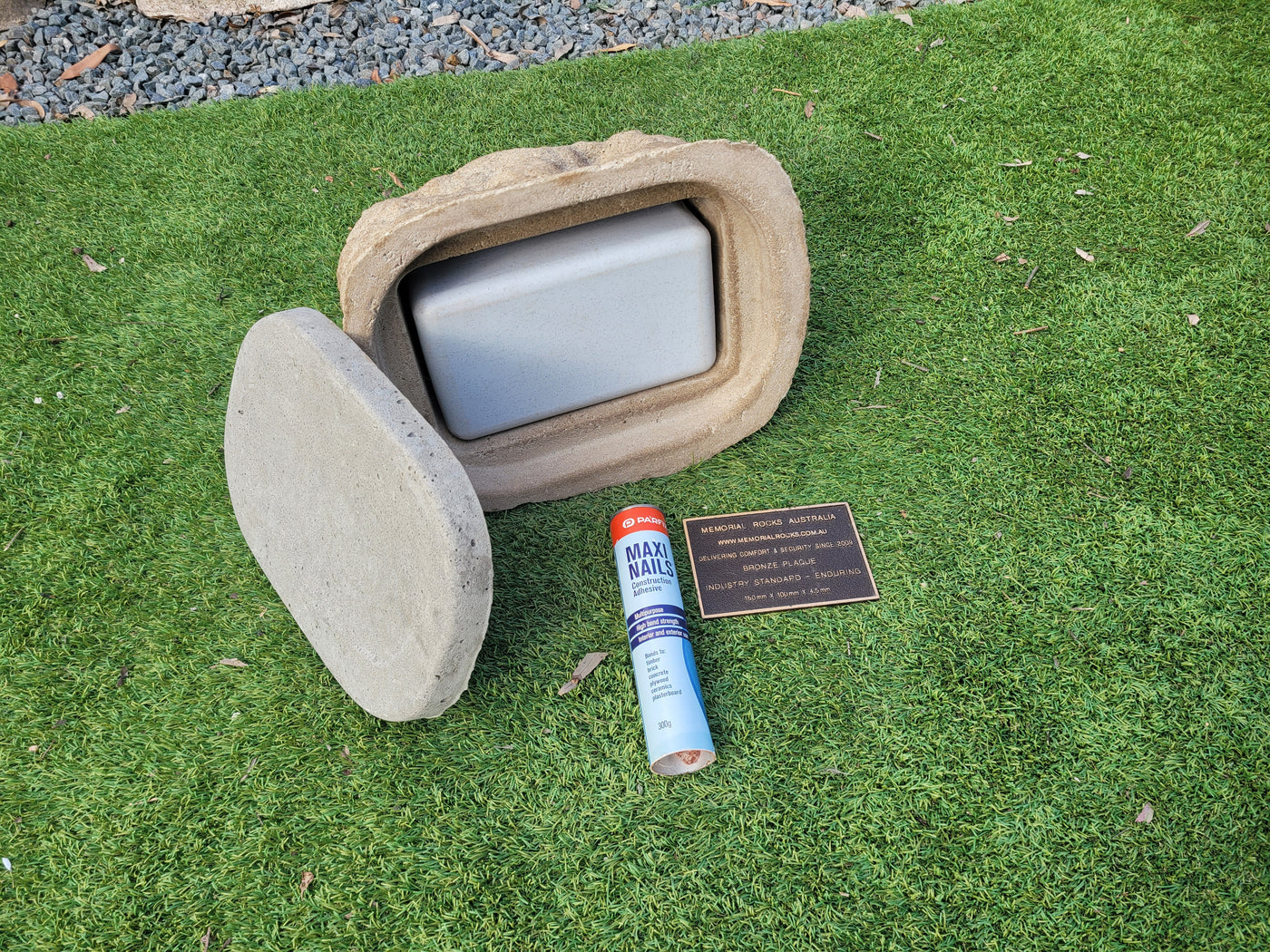 Memorial Rock Urns are a loving practical alternative for the safe keeping of a loved one's ashes. This Memorial rock has an incorporated flat space for up to a 180mm x 120mm x 4.5mm Plaque or our heart plaque. (200mm x 150mm) PLAQUE SOLD SEPARATELY The blue plastic standard Australian sized cremation urn seen in the pictures demonstrates the ...