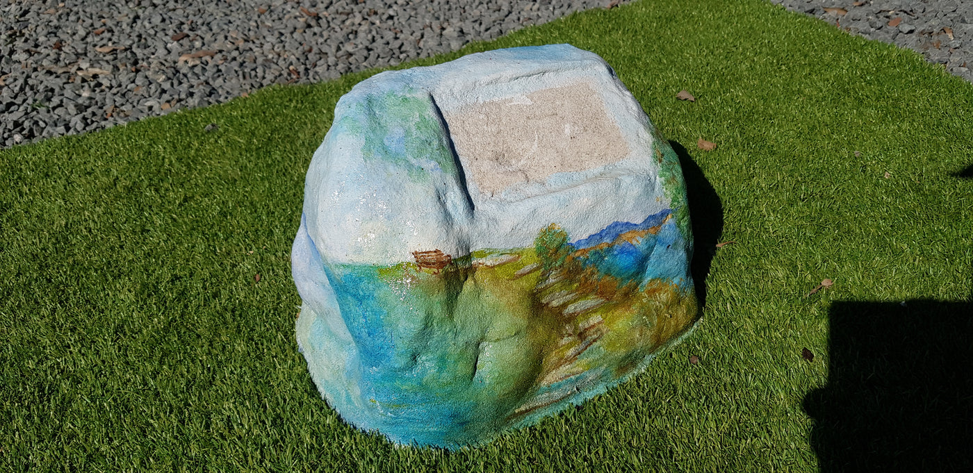 Memorial Rock Urns are a loving practical alternative for the safe keeping of a loved one's ashes. This Memorial Rock Urn has a small internal sealed container for partial ash interment. This Partial Ash Urn Memorial rock has an incorporated flat space for a 100 mm x 75mm x4.5mm industry standard bronze plaque. PLAQUE SOLD SEPARATELY Proudly...