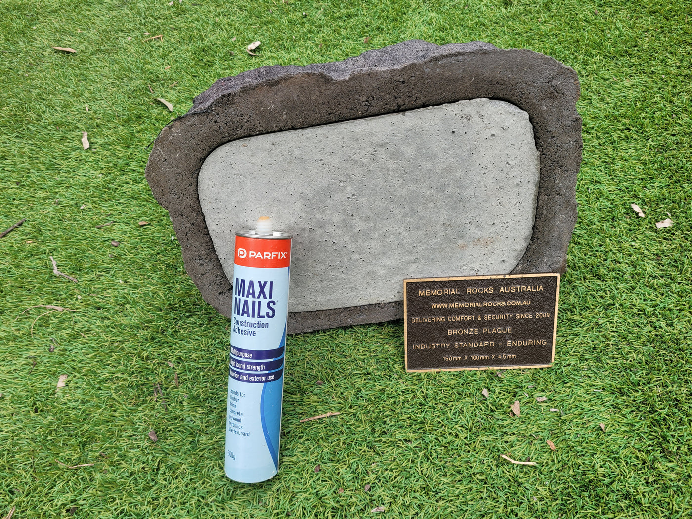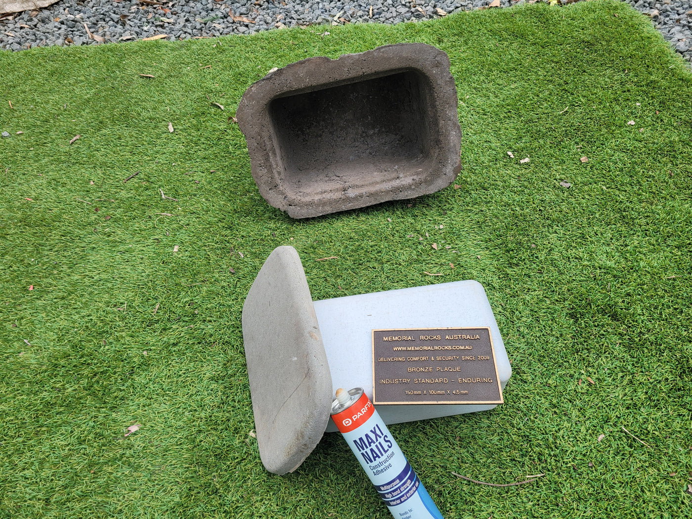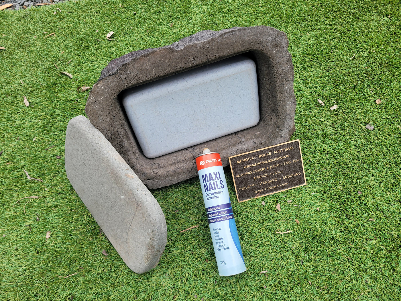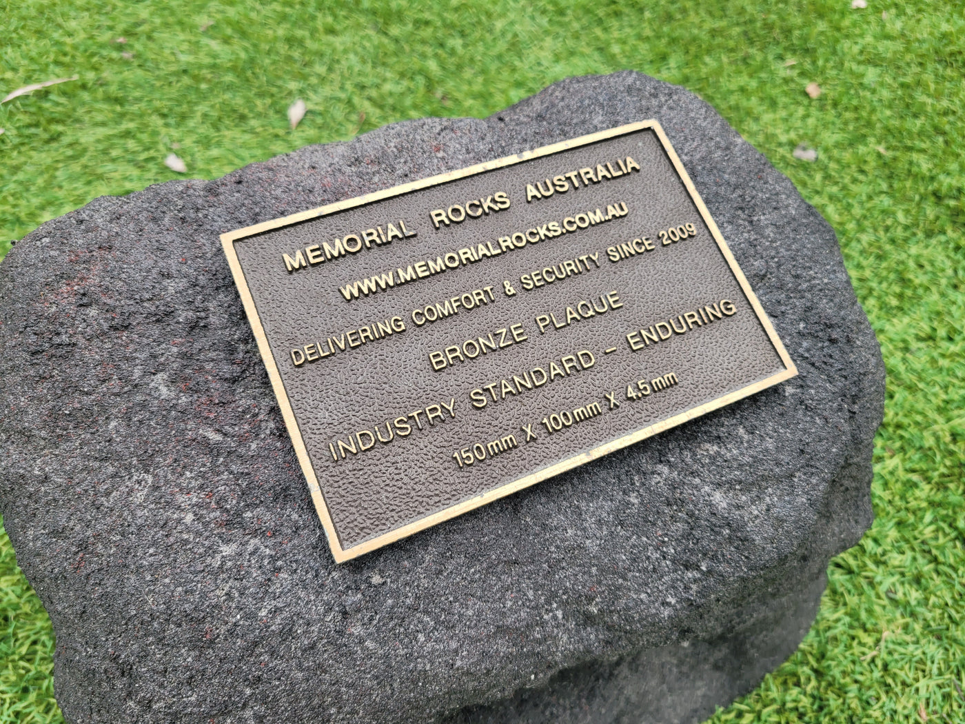 Memorial Rock Urns are a loving practical alternative for the safe keeping of a loved one's ashes. This Memorial rock has an incorporated flat indented recess space for a 150mm x 100mm x4.5mm industry standard bronze plaque. PLAQUE SOLD SEPARATELY Proudly an Australian made, original product. Operating since 2009. Regular size. Lightweight (a...