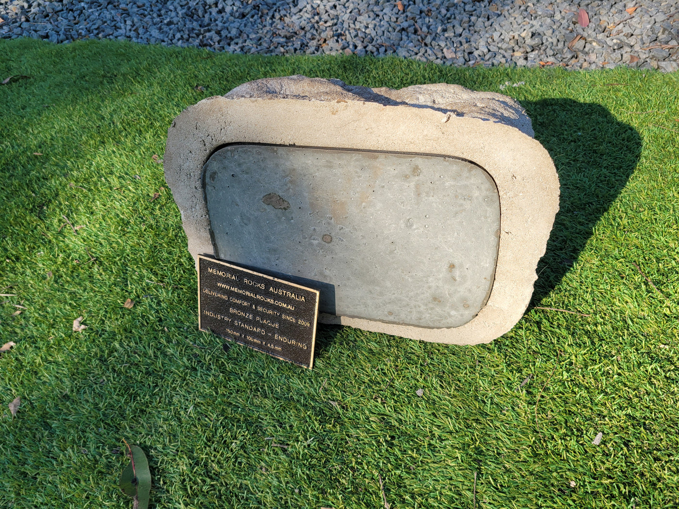 Memorial Rock Urns are a loving practical alternative for the safe keeping of a loved one's ashes. This Memorial rock has an incorporated flat indented recess space for a 150mm x 100mm x4.5mm industry standard bronze plaque. PLAQUE SOLD SEPARATELY Proudly an Australian made, original product. Operating since 2009. Regular size. Lightweight (a...