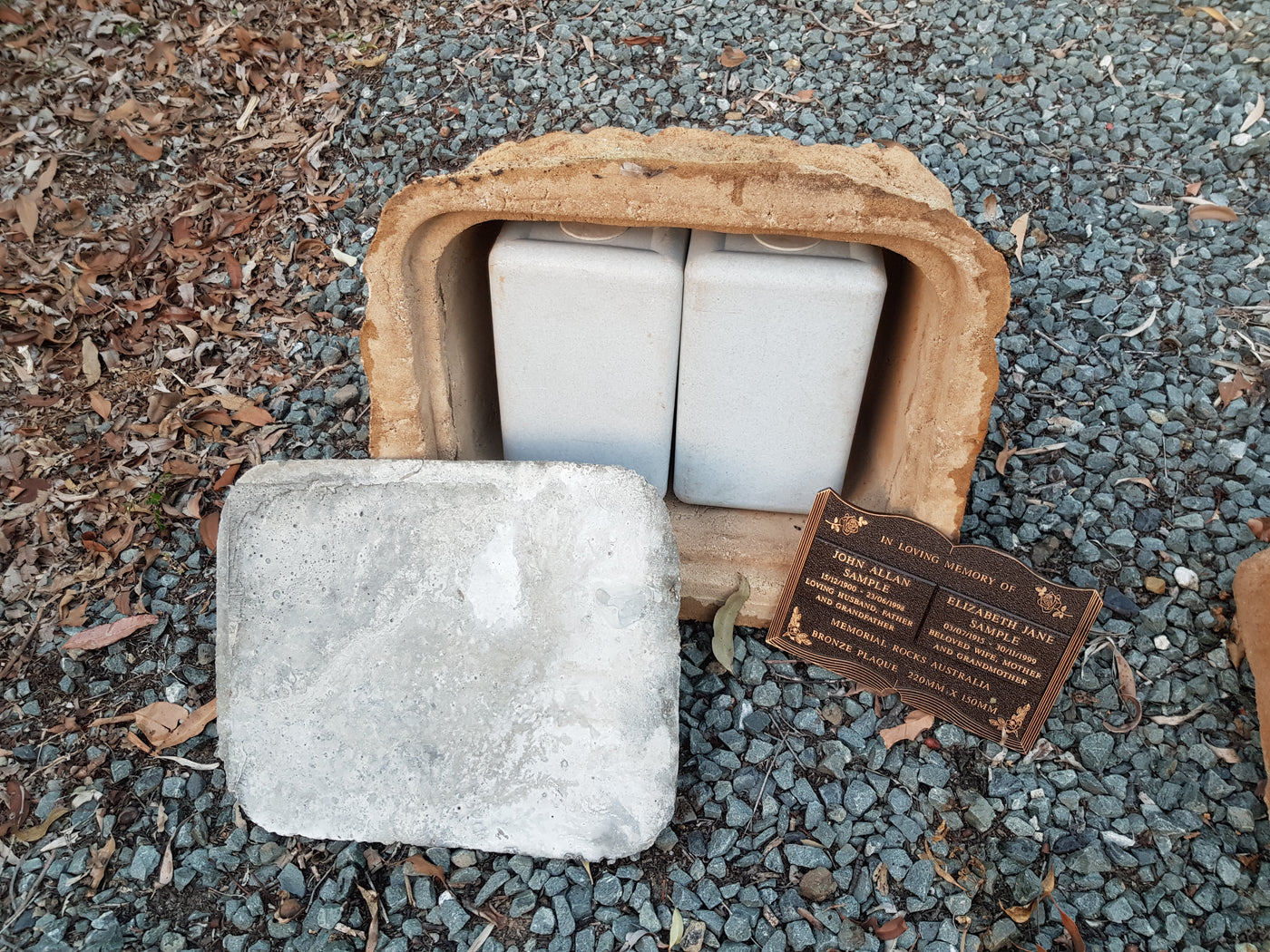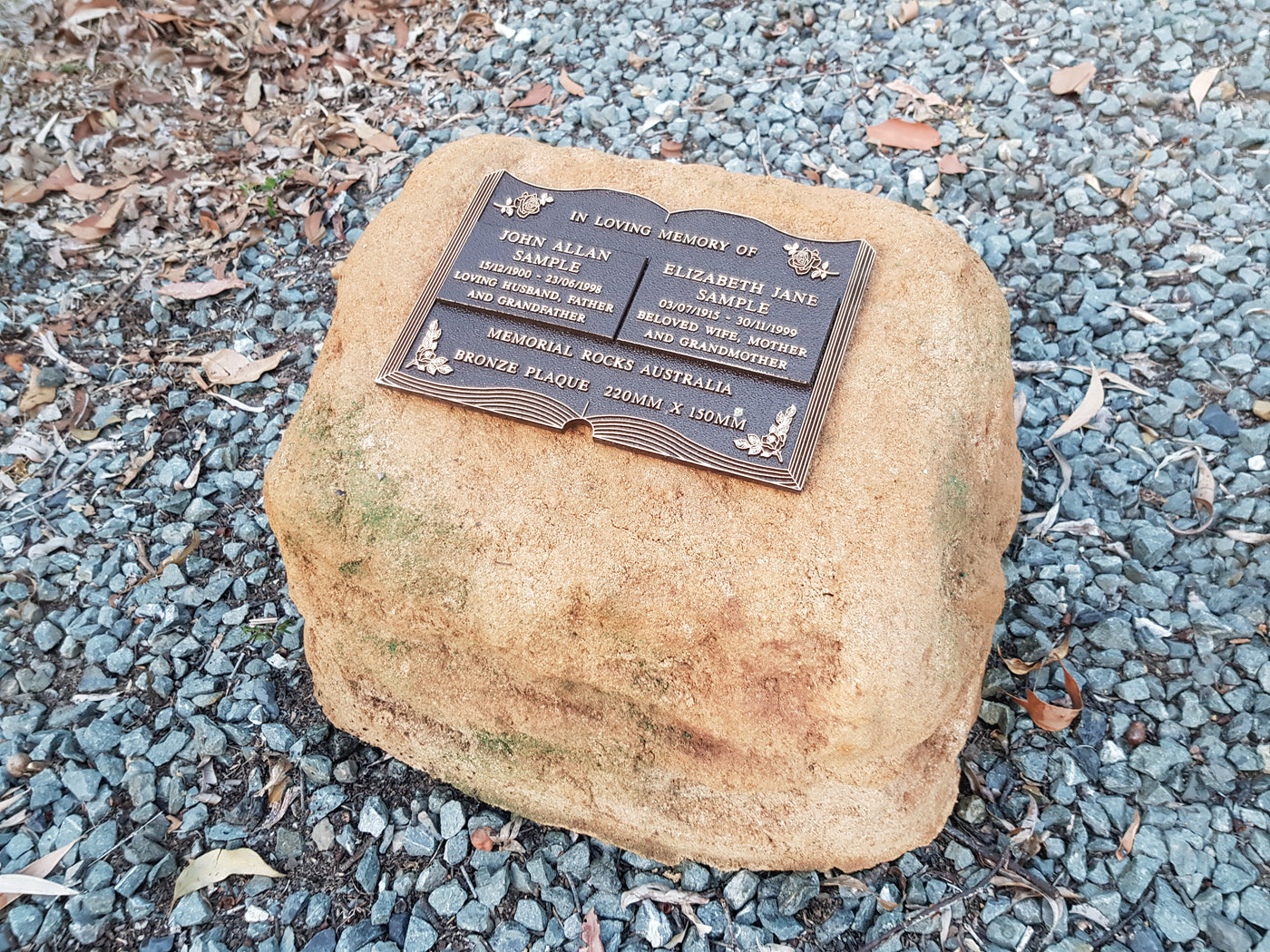 This Memorial Rock Urn has a useable flat section up to 200mm x 150mm for a quality bronze plaque or 2 smaller plaques (to perhaps accommodate a 2nd plaque at a much later time) and or a picture. Suggested size for a single plaque 200mm x150mm. SOLD SEPARATELY.
