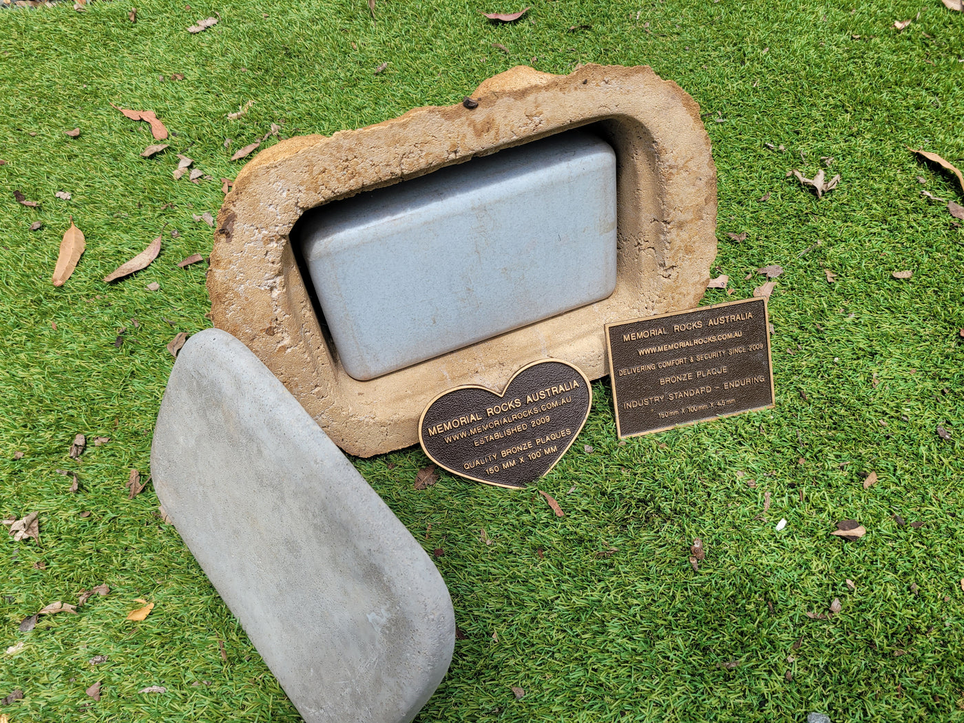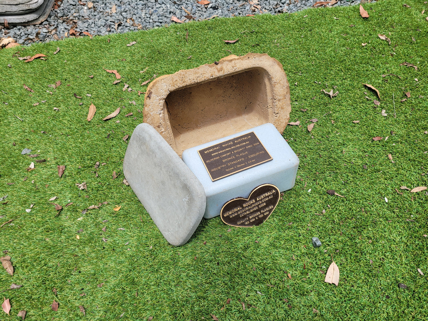 Memorial Rock Urns are a loving practical alternative for the safe keeping of a loved one's ashes. This Memorial rock has an incorporated flat indented recess space for a 150mm x 100mm x4.5mm industry standard bronze plaque. PLAQUE SOLD SEPARATELY Proudly an Australian made, original product. Operating since 2009. Regular size. Lightweight (a...